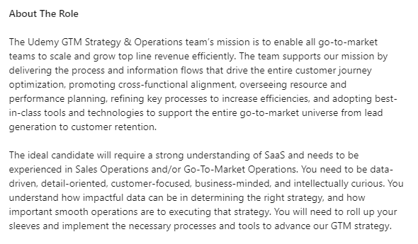 Hereβs an example of a sales ops manager job description for Udemy: