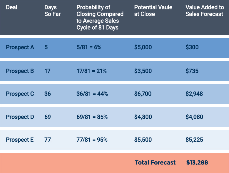 A salesperson that has spent two months on an opportunity that typically closes in four months means the forecast will indicate a 50% likelihood of closing.