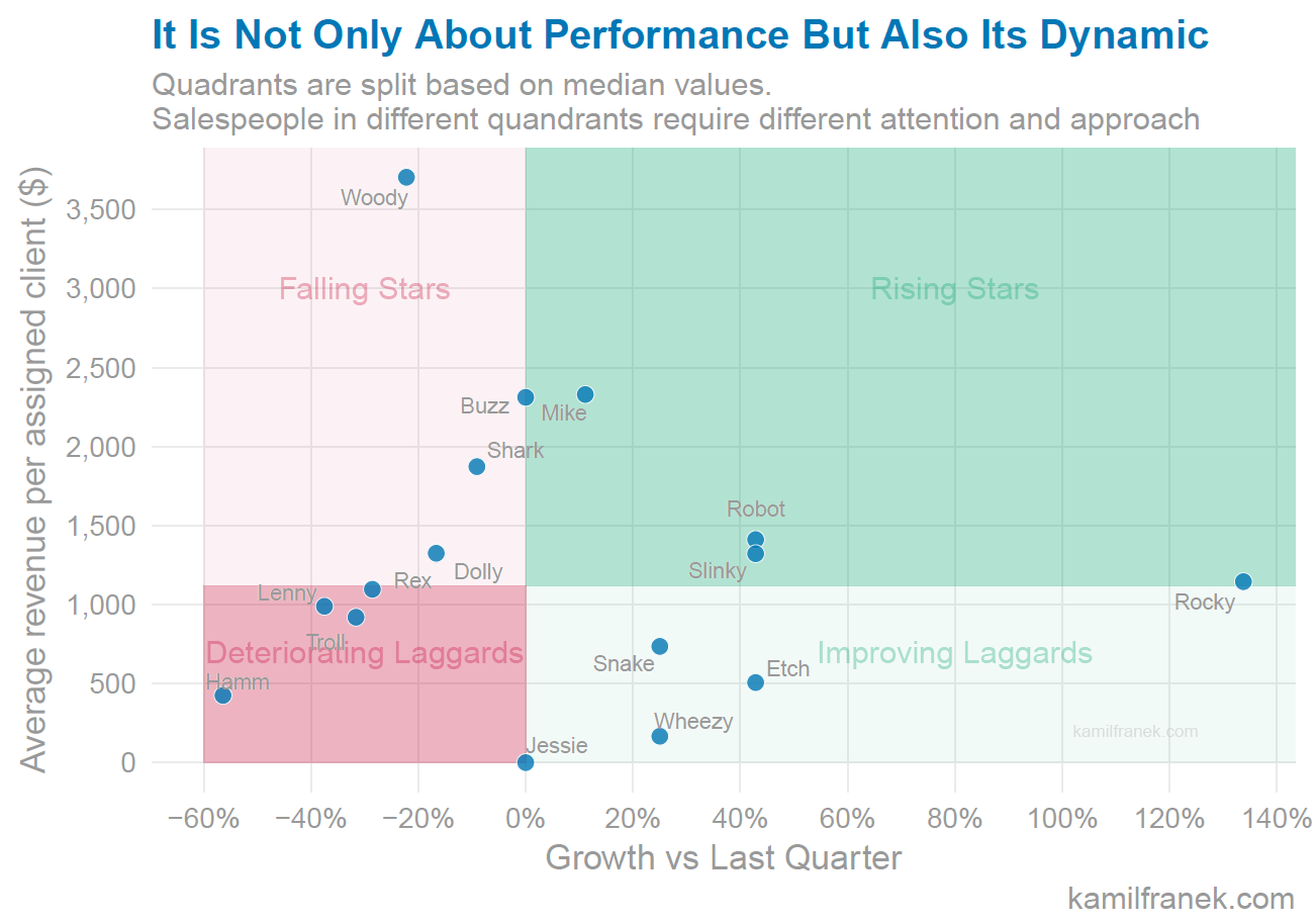 - Deteriorating laggards: Under-performing reps that have further declined in performance