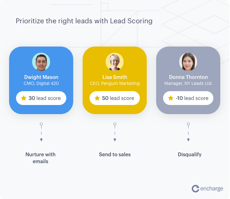 Encharge allows you to set your lead scoring criteria and automatically perform actions based on their score. For example, high lead scores can be sent to the CRM database and assigned to a sales rep.