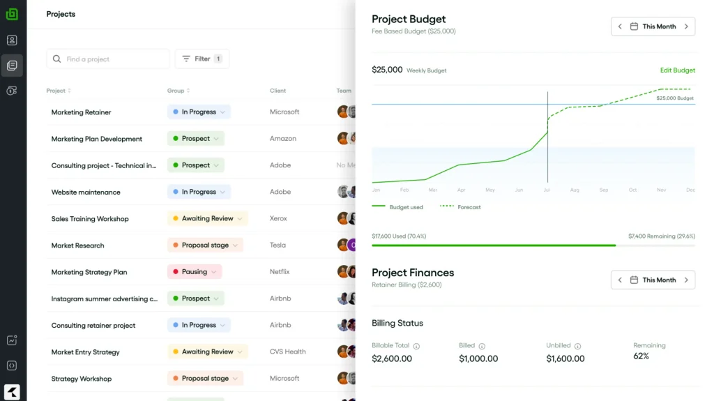 With Bonsai, agencies can organize tasks using Kanban boards and Gantt charts, keeping projects on schedule and helping teams stay focused. Bonsai also offers advanced resource planning tools to allocate workloads efficiently and prevent bottlenecks. Plus, its time-tracking and budget management features give agencies clear insights into profitability and help streamline billing, all from one place.