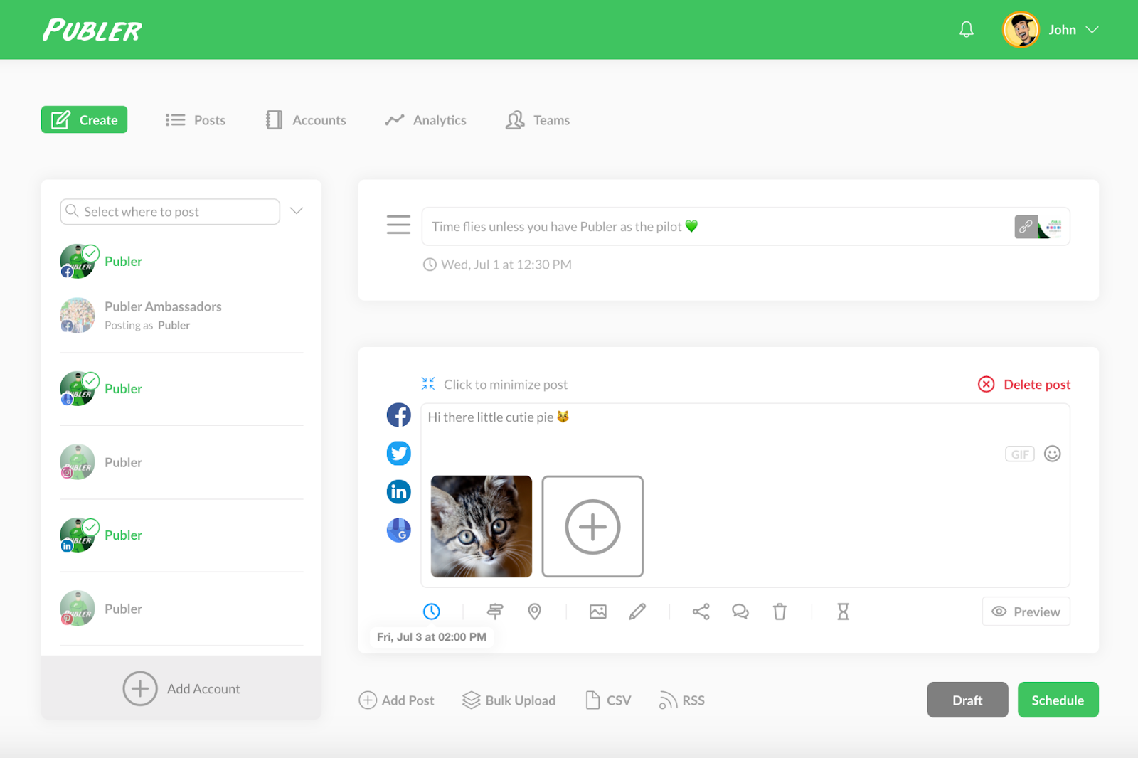 Publer allows you to schedule posts on Facebook, Instagram, Tiktok, Twitter, LinkedIn, and even Pinterest, GoogleMy Business, and YouTube. The best thing is that here’s a generous free tier for you to try.